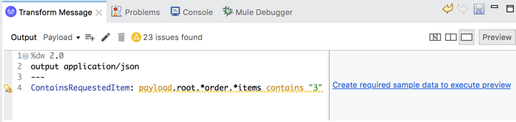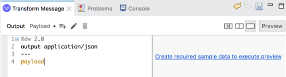 The source code area on the left is the place where you are going to add DataWeave scripts, and the Preview pane on the right is where you view the output of the scripts.