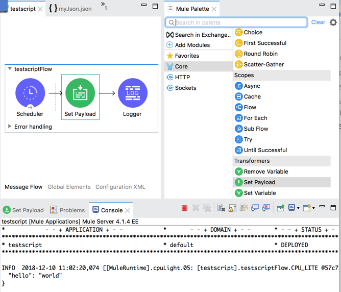 • The Console tab of the running Mule app (testscript) displays the payload from Set Payload.