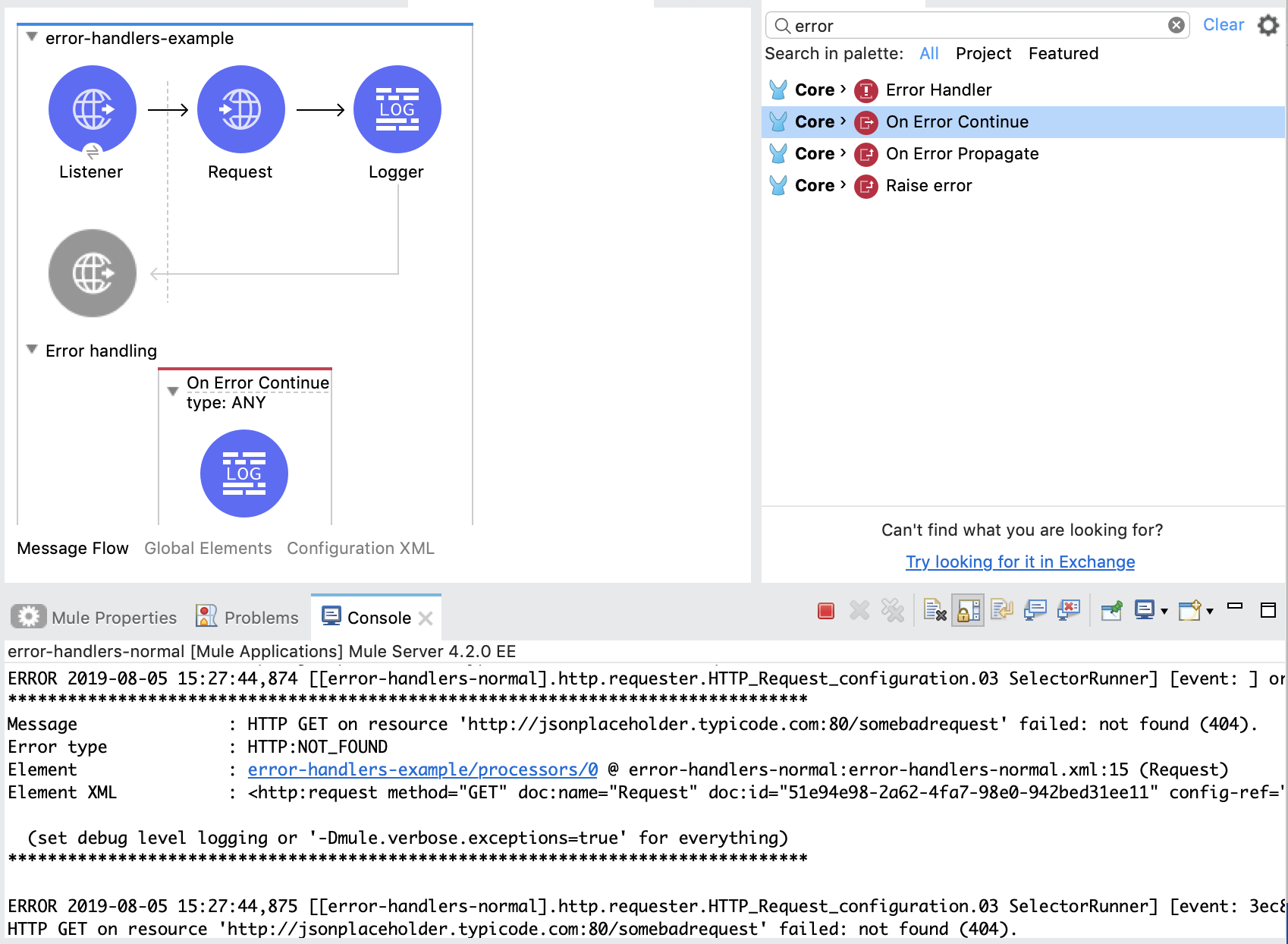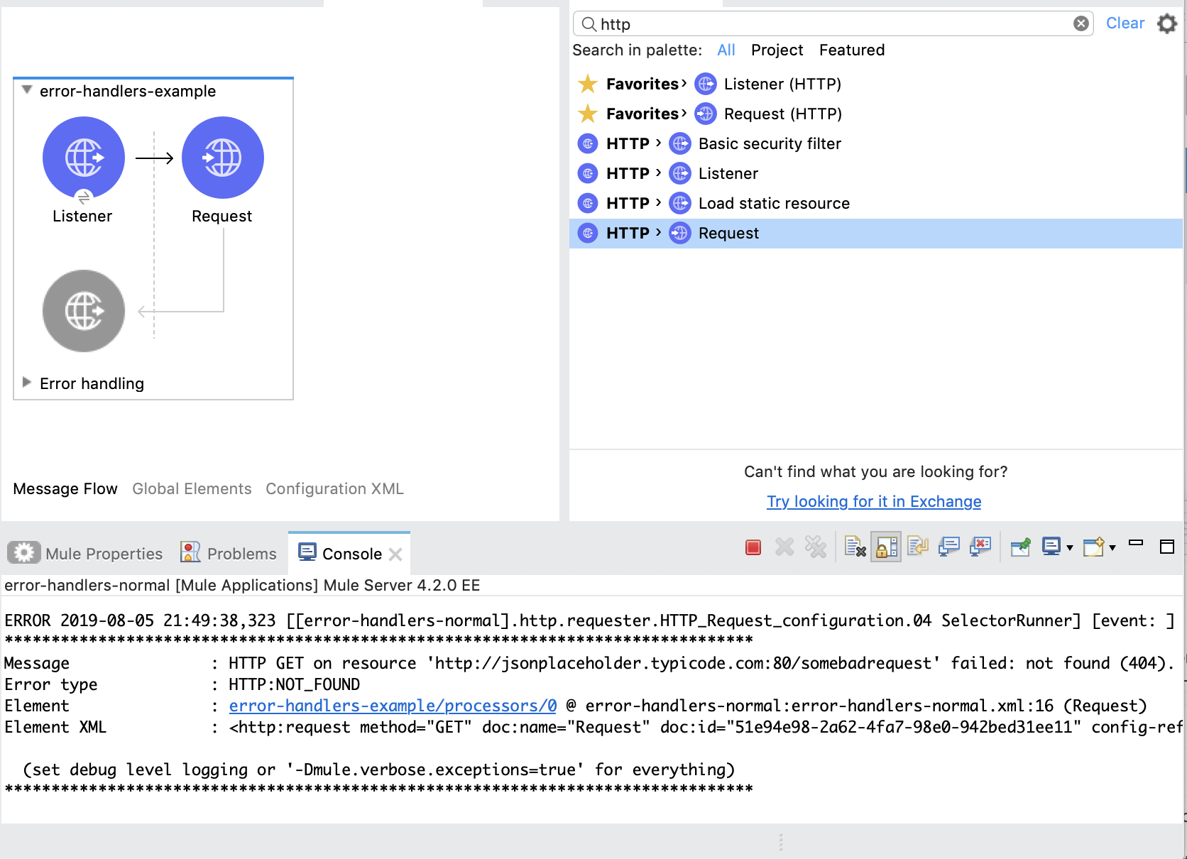 OnErrorPropagateHandler, propagates a 404 error returned from the HTTP GET request. Mule identifies this error as HTTP:NOT_FOUND.**************************************************************************** ERROR 2019-08-05 21:49:38,323 [[error-handlers-normal].http.requester.HTTP_Request_configuration.04 SelectorRunner] [event: ] org.mule.runtime.core.internal.exception.OnErrorPropagateHandler: **************************************************************************** Message : HTTP GET on resource 'http://jsonplaceholder.typicode.com:80/somebadrequest' failed: not found (404). Error type : HTTP:NOT_FOUND Element : error-handlers-example/processors/0 @ error-handlers-normal:error-handlers-normal.xml:16 (Request) Element XML : <http:request method="GET" doc:name="Request" doc:id="51e94e98-2a62-4fa7-98e0-942bed31ee11" config-ref="HTTP_Request_configuration" path="/somebadrequest"> </http:request> (set debug level logging or '-Dmule.verbose.exceptions=true' for everything) **************************************************************************** -