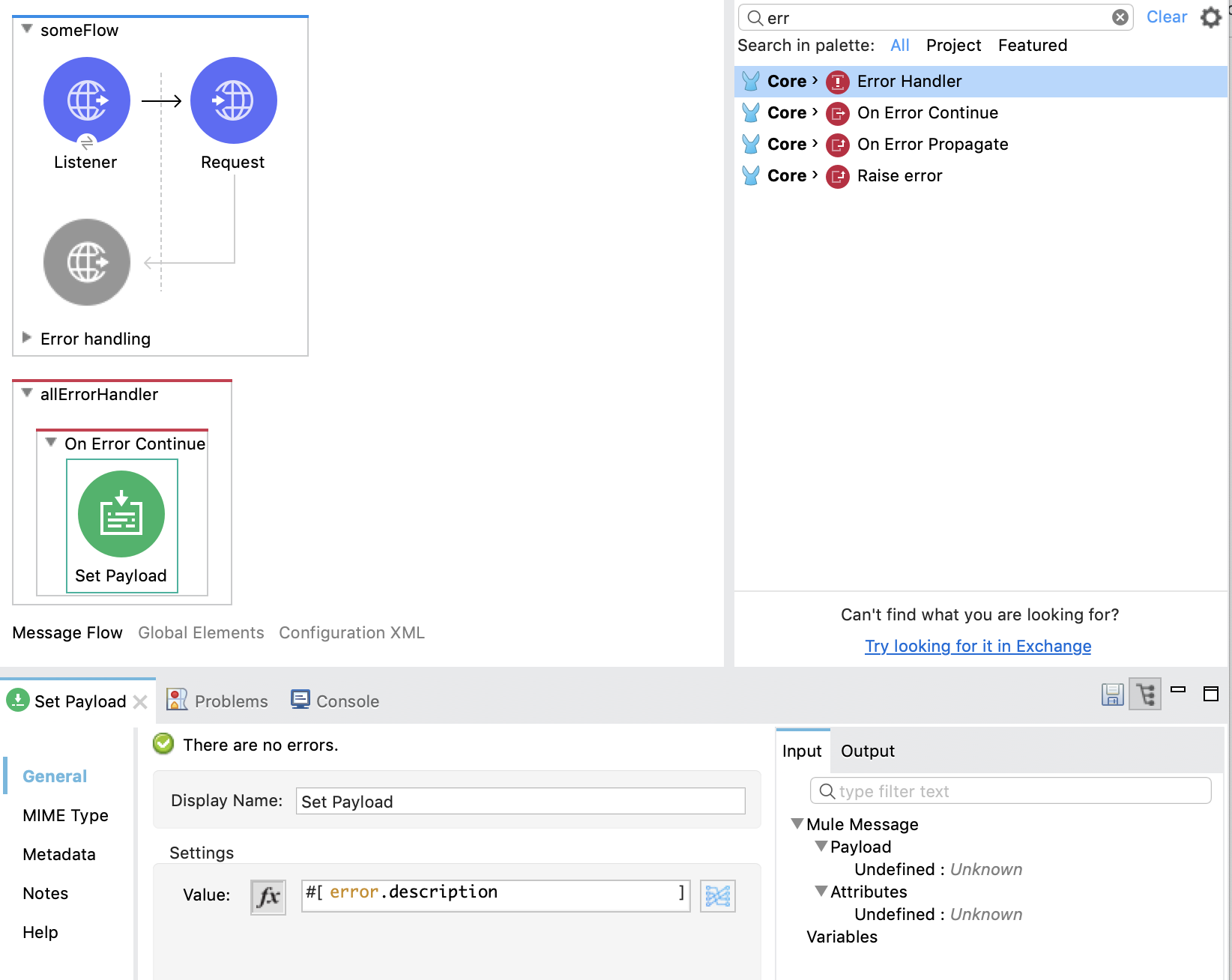 Note that the Set Payload component is an example. You can use other components, such as a Logger, and you can write your own error message inside that component. The Set Payload example uses a Mule variable for the error description (see the