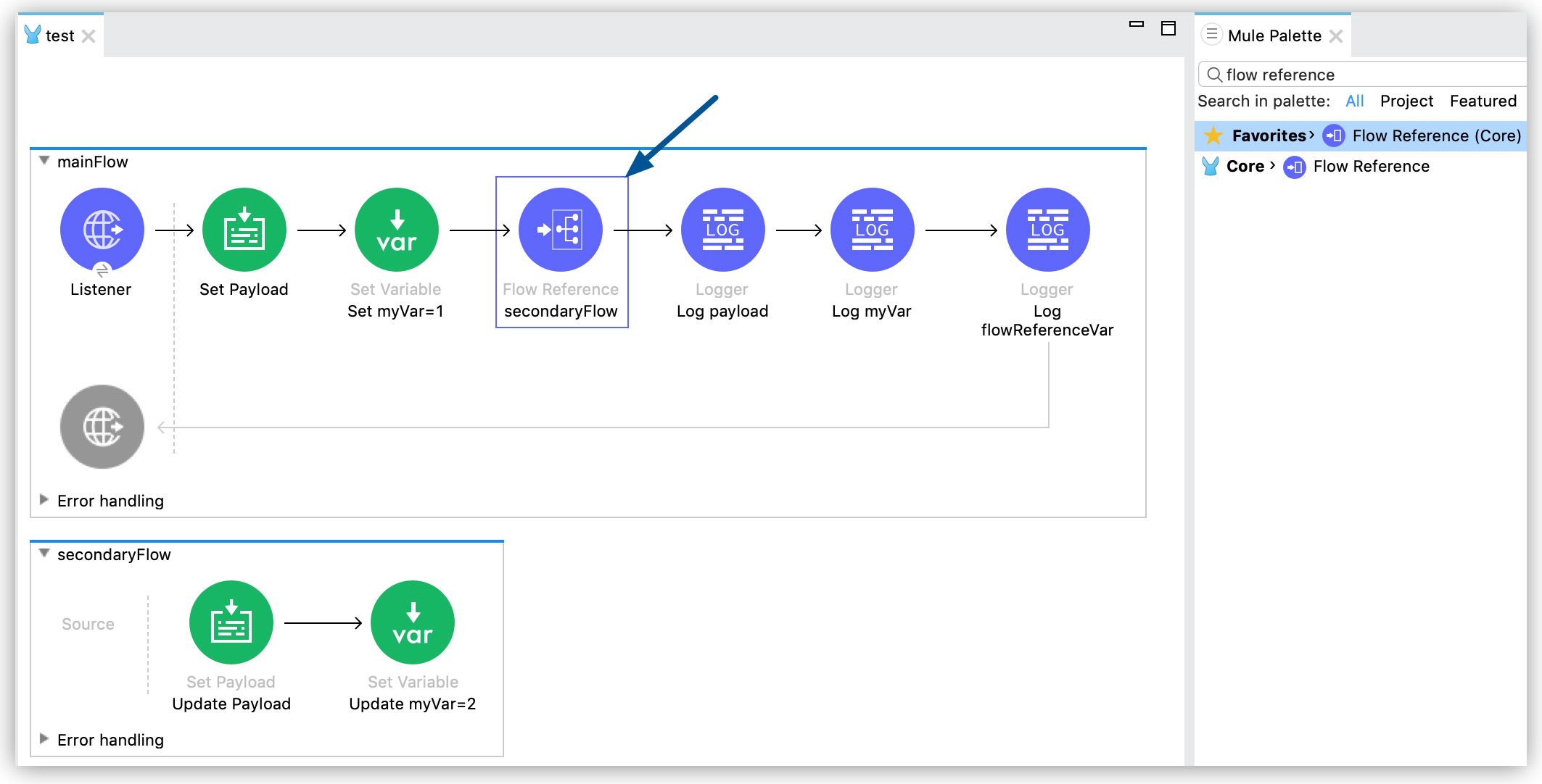<flow-ref doc:name="secondaryFlow" name="secondaryFlow" target="flowReferenceVar"/>