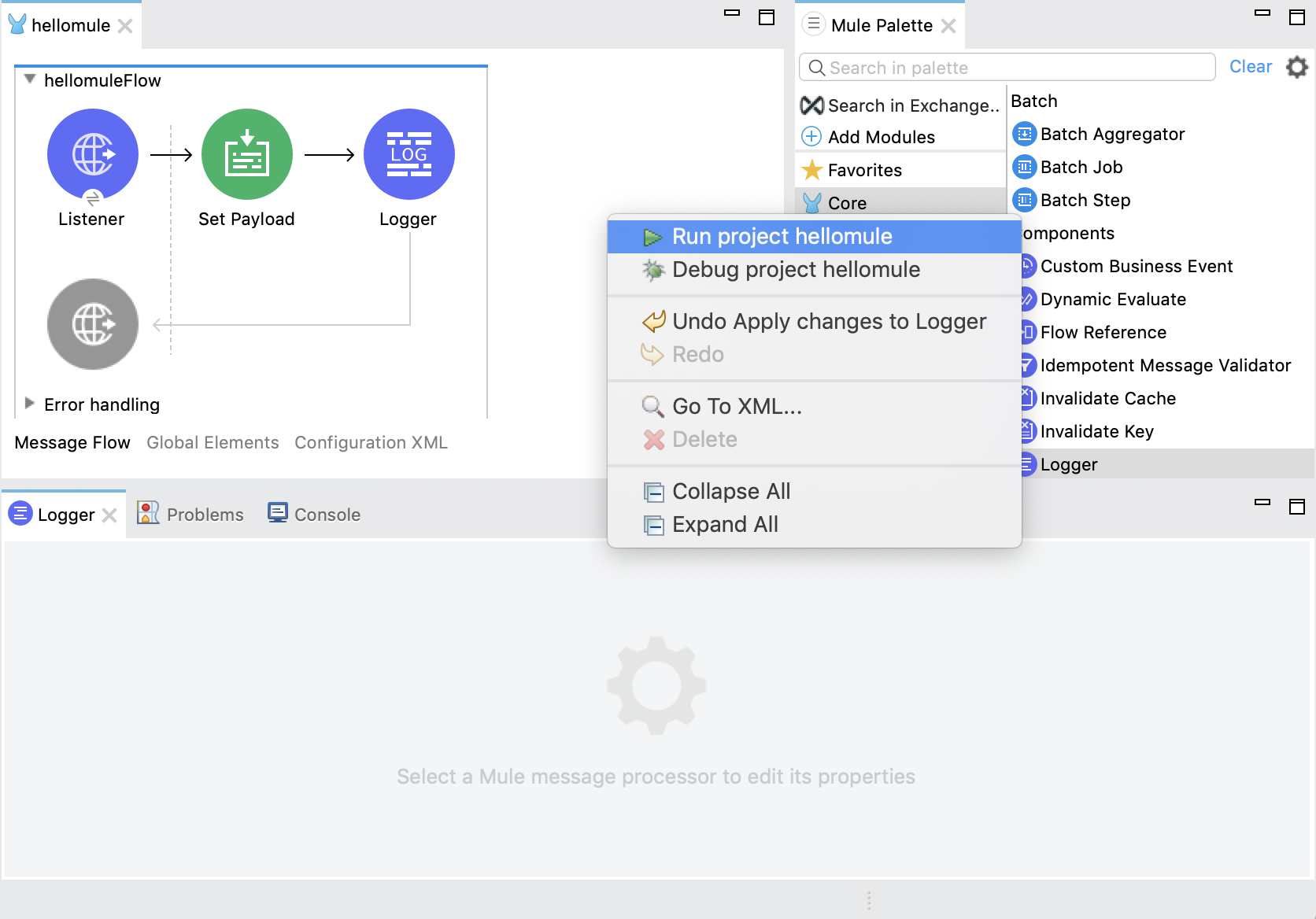 Run your hellomule application by right-clicking within the Anypoint Studio canvas and selecting Run project hellomule.