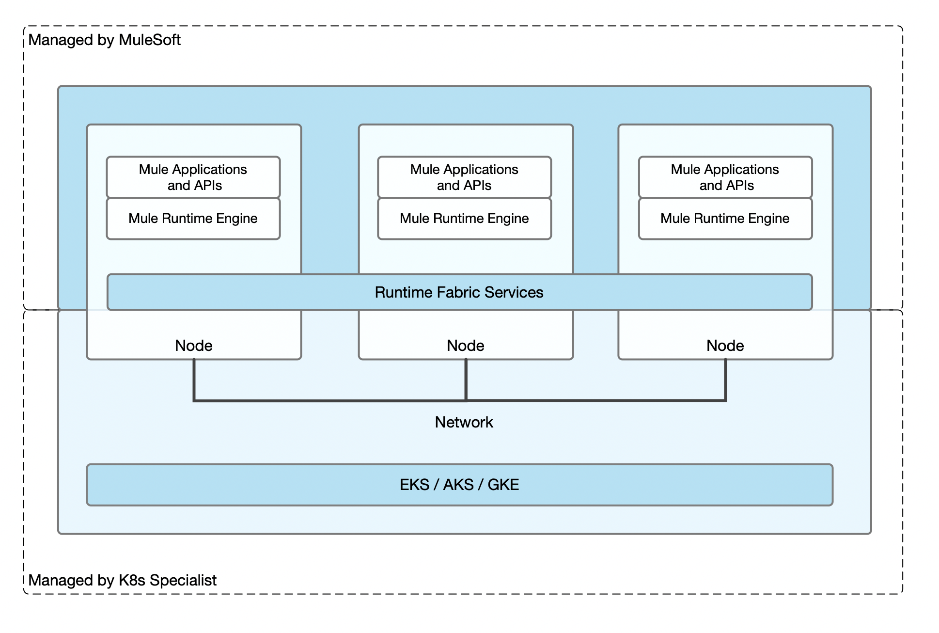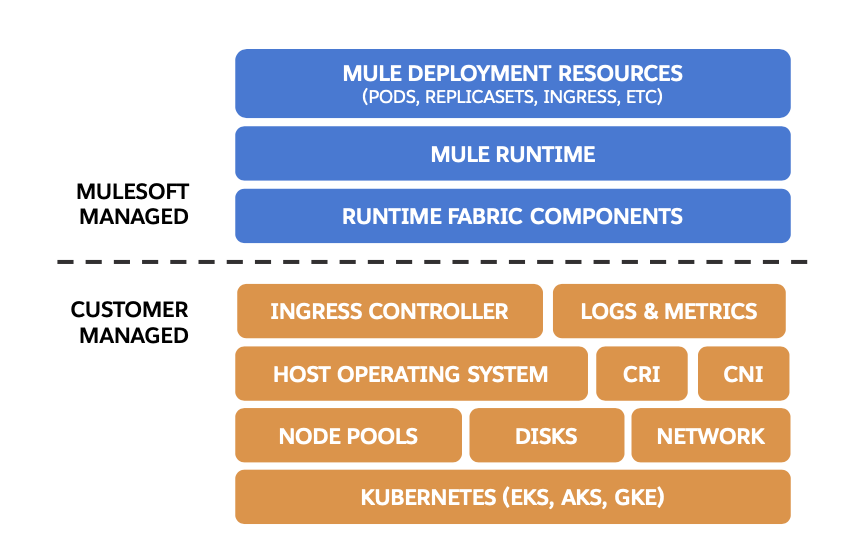 MuleSoft is responsible for providing support for Runtime Fabric services, the Mule Runtime server, and Mule applications. You are responsible for creating, configuring and managing the Amazon EKS, AKS, or GKE environment.