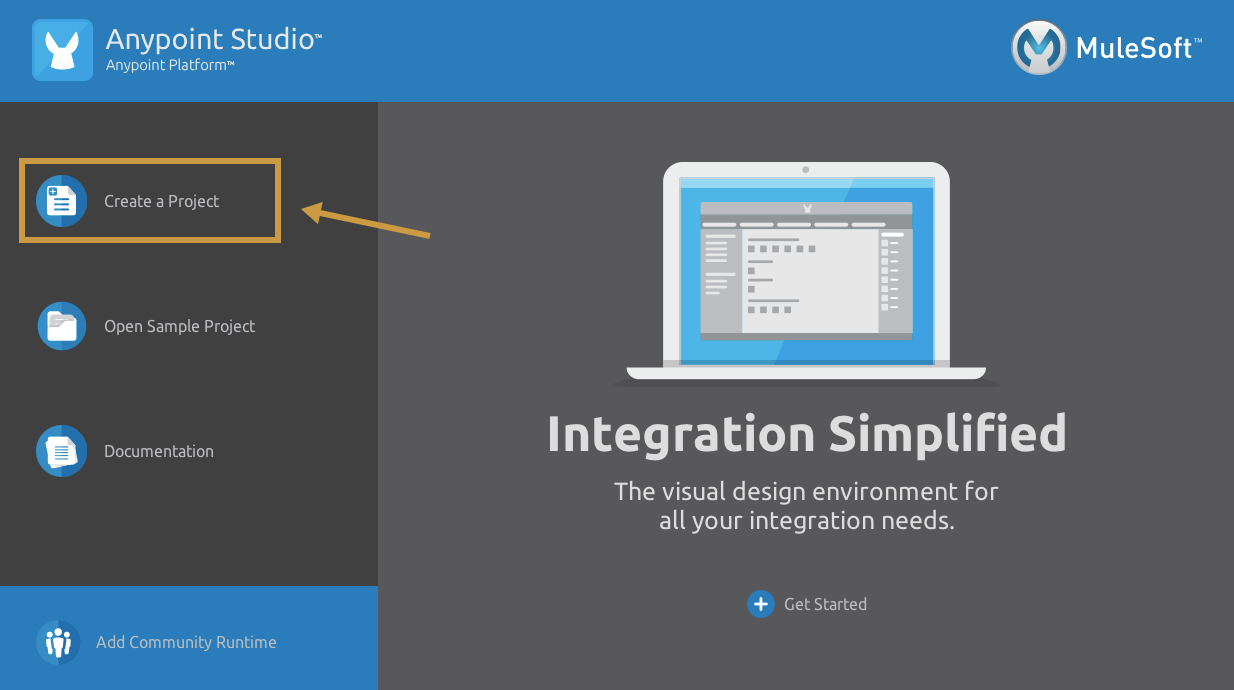 If this is the first time you have launched Studio, you see a Welcome screen. Click Create a Project to dismiss the screen and jump straight to the New Mule Project wizard.