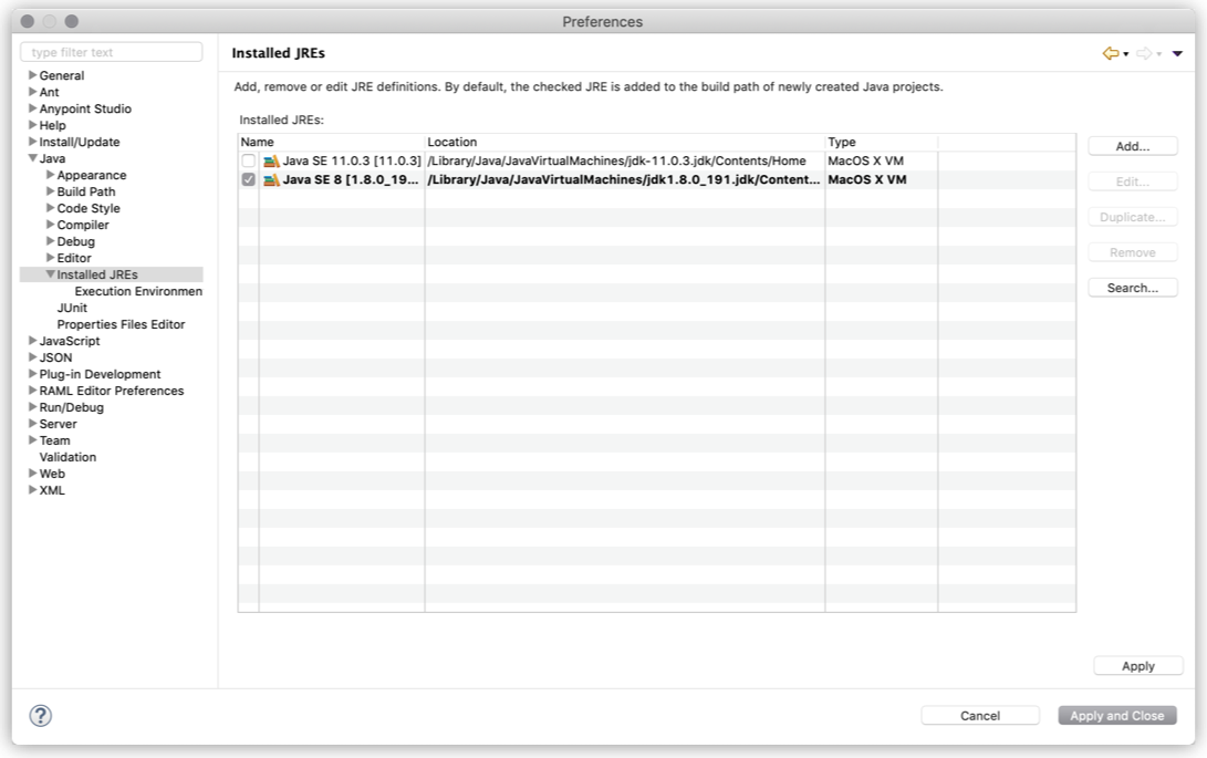 You can select any of your installed JDKs as the default Java runtime environment that Studio uses to run your Mule project.